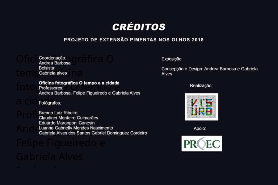 Esta página tem o intuito de ser um espaço de visibilidade para parte do acervo de ensaios visuais e sonoros montado pelo VISURB em seus projetos de pesquisa e extensão, como o Projeto Pimentas no olhos que realiza oficinas fotográficas em vários bairros de São Paulo e Guarulhos, notadamente no bairro dos Pimentas onde o projeto nasceu.